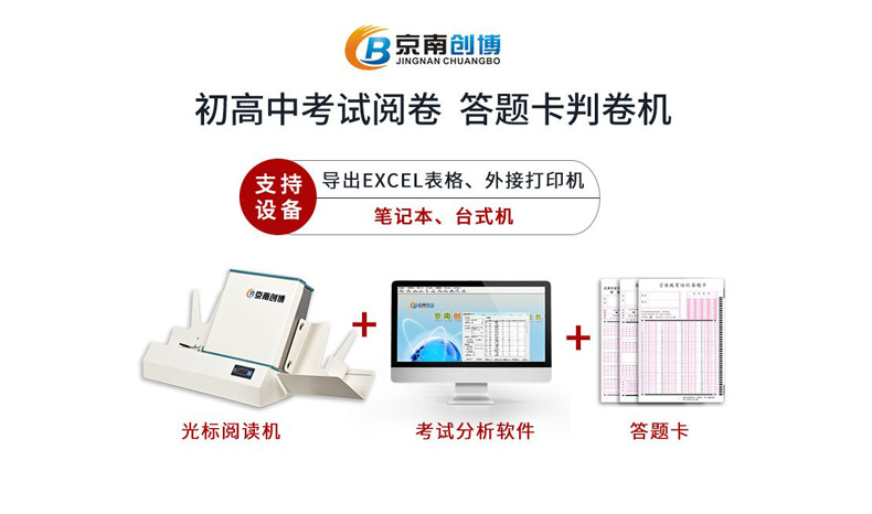 智能識(shí)別閱卷,京南創(chuàng)博閱卷機(jī)器均為一體機(jī),免驅(qū)安裝,即插即用,連接電腦就可以使用,機(jī)器自帶一套考試分析軟件。讀卡快速,識(shí)別率高,多種成績(jī)分析。